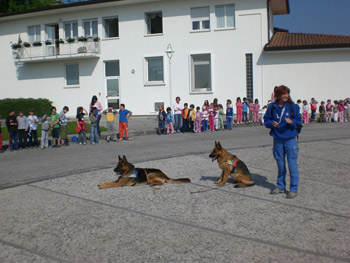 Ciò consiste in una piccola lezione dove si fa vedere come opera un uc di soccorso, come e perché si addestra un cane all’ubbidienza e qual è il corretto approccio che un bambino deve avere nei confronti di un cane.